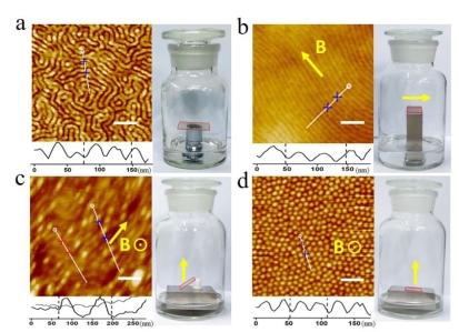 呈無規的分相結構; (b) 在磁鐵磁力水平于基底作用下,嵌段共聚物沿磁力方向運動,自組裝結構為高度有序單向平行排列; (d) 在磁鐵磁力垂直于基底作用下,分子鏈自組裝排列形成相互獨立的圓柱狀分相結構; (c) 磁鐵磁力與基底呈45度角時候產生兩個方向排列的混合。
