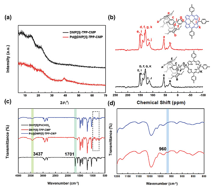 近日,吉林大學(xué)楊英威教授團(tuán)隊(duì)基于新型功能材料的結(jié)構(gòu)設(shè)計(jì)和應(yīng)用開發(fā),巧妙構(gòu)筑了可以精確調(diào)控鈀納米粒子成核、生長的新型共軛大環(huán)聚合物材料DMP[5]-TPP-CMP。其中,兩種類型大環(huán)分子柱芳烴和卟啉作為主要構(gòu)筑單元,通過對合成過程中溶劑、溫度的調(diào)節(jié),成功制備得到30 nm左右的聚合物粒子。在醋酸鈀條件下,利用特殊的大環(huán)限域效應(yīng)制備得到負(fù)載有鈀納米粒子的復(fù)合材料Pd@CMP。透射電子顯微成像(TEM)和粉末X射線衍射(PXRD)等測試表征表明DMP[5]-TPP-CMP上成功負(fù)載了粒徑分布在9 nm左右的Pd納米粒子;同時,X射線光電子能譜(XPS)和紅外光譜(FT-IR)則表明卟啉N和柱芳烴兩端官能團(tuán)-OCH3中的O對Pd都有一定的配位作用,二者協(xié)同調(diào)控Pd納米粒子的成核、生長。通過設(shè)計(jì)不含有柱芳烴大環(huán)的對照聚合物,并采取相同的負(fù)載策略,得到了粒徑分布均一性較差的Pd納米粒子。由此可以證明,兩類大環(huán)在金屬Pd納米粒子的成核、生長過程都至關(guān)重要。