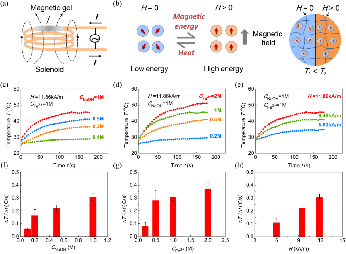 磁性水凝膠的磁熱效應(yīng)的機制是磁性粒子的Neel耗散,即磁性粒子的磁矩在外界磁場下排列取向和去取向。通過調(diào)控氫氧化鈉的濃度,鐵離子的濃度以及磁場強度,可以改變磁性雙網(wǎng)絡(luò)凝膠的磁熱行為。利用磁熱效應(yīng),作者展示了磁性雙網(wǎng)絡(luò)凝膠的兩個應(yīng)用:生物組織加熱和藥物釋放。