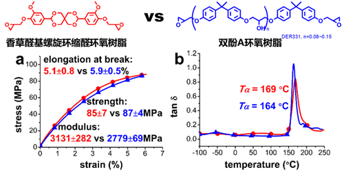 圖1 香草醛基螺旋環雙縮醛環氧樹脂(紅)與雙酚A環氧樹脂(藍)性能對比