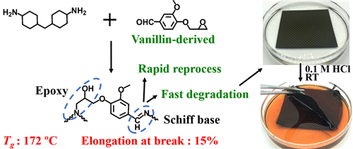 熱固性樹脂具有優異的機械性能、熱學性能、尺寸穩定性、加工性能以及化學穩定性等,在電子封裝材料、復合材料、膠粘劑及涂料等領域都具有廣泛應用。然而由于其高度化學交聯的三維網絡,熱固性樹脂很難回收,同時也影響了其下游產品包括碳纖維復合材料、電子產品等的回收。賦予熱固性樹脂可降解性被認為是解決熱固性樹脂回收問題的一條重要途徑。然而對于含一般降解基團如酯鍵、二硫醚鍵、碳酸酯鍵等的熱固性樹脂,化學交聯密度低時,降解速度快,但熱學、力學性能差;化學交聯密度高時,綜合性能尤其是熱學、力學性能好,但降解性能差甚至難降解。要實現高化學交聯密度下的快速降解,一條有效途徑就是采用易可控降解的基團。