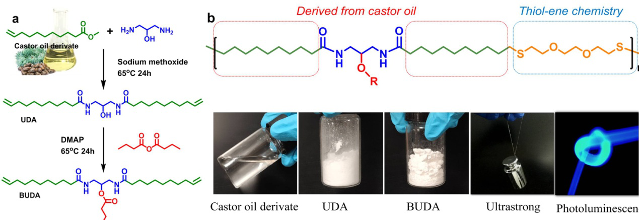近日,安徽農業大學生物質分工程中心汪鐘凱教授團隊圍繞農林生物質資源的高值化利用這一主題,將蓖麻油轉化為具有超高強度的熒光彈性體,并且實現了對其結構性能的簡便調控。該工作利用蓖麻油衍生物十一烯酸甲酯與1,3-二氨基-2-異丙醇的高效反應制備帶有酰胺基團的雙烯單體(UDA)。UDA上的羥基可以通過酯化反應制備帶丁基的雙烯單體(BUDA)。通過“巰基-烯烴”點擊聚合制備功能性聚酰胺,進一步調節分子組成實現對功能性聚酰胺熱力學性能、結晶性能、超分子微結構及機械性能的精確控制。再利用循環拉伸處理使其內部納米晶體實現類似于蜘蛛絲的仿生取向結構,最終獲得抗拉強度超過200兆帕的具有超高機械強度的彈性體。該成果為挑戰蜘蛛絲仿生材料這一世界性課題開辟了一條新的途徑。