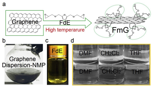 圖1 (a)通過DA反應制備FmG的機理,(b)FmG產物,(c)呋喃環氧單體,(d)改性前后FmG在溶劑中的分散效果對比
