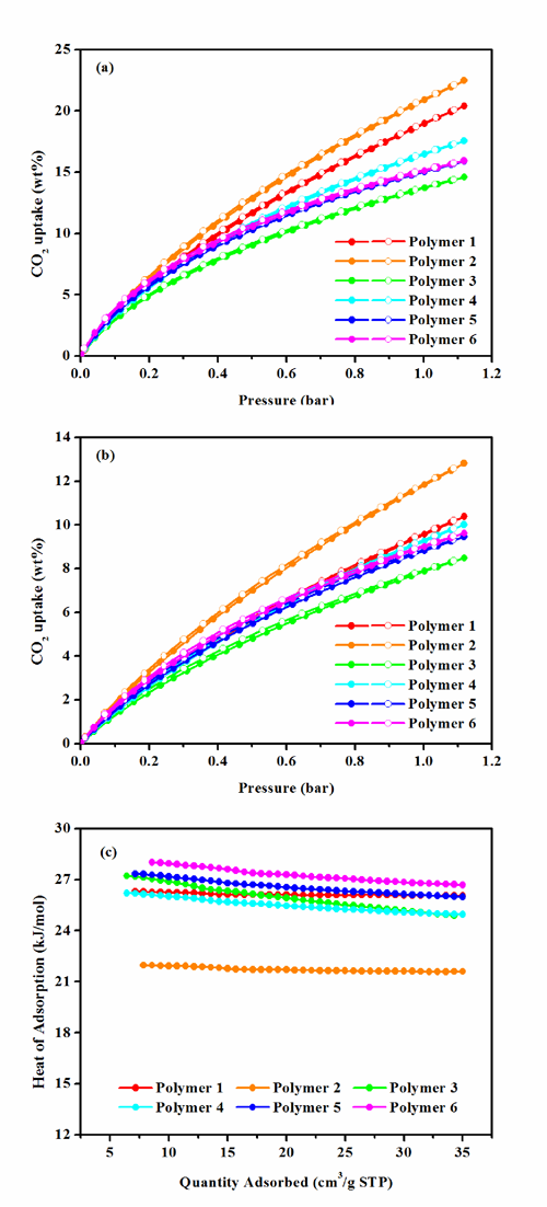 圖3. (a)273.15 K下聚合物的CO2吸附脫附曲線,(b)298.15 K下聚合物的CO2吸附脫附曲線,(c) 以吸附量為函數(shù)的聚合物的CO2吸附熱曲線