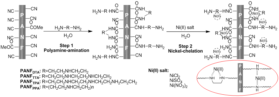 最近,該課題組再次在催化領域著名期刊Journal of catalysis發表文章。他們先通過在纖維的表層構筑不同鏈長的多級二胺配體,進而將其用于絡合不同種類的鎳鹽,并借助載體功能基和多功能協同等高分子效應,系統調控配體鏈接長短和陰離子的種類,成功獲取了一種纖維負載型鎳配合物催化劑(圖3)。該工作還采用多種表征技術,證實了纖維負載催化劑制備途徑的可靠性以及使用過程中的穩定性,并發現其在末端炔烴的碳氫鍵活化反應中具有顯著的催化應用性能(J. Catal. 2019, 372, 321-329)。