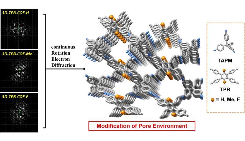 研究表明,3D-TPB-COFs均具有非常好的結(jié)晶性,SEM顯示顆粒大小約為1微米。利用cRED技術(shù),他們成功解析了三種COFs各自的晶體結(jié)構(gòu)(五層嵌套的pts拓?fù)浣Y(jié)構(gòu))。需強(qiáng)調(diào)的是,通過(guò)cRED測(cè)得的數(shù)據(jù)分辨率能夠達(dá)到0.9-1.0 ?,可精確定位COFs中所有非氫原子的位置。另外,通過(guò)引入不同官能團(tuán)可精確控制3D-TPB-COFs孔道環(huán)境,其在CO2/N2選擇性吸附過(guò)程中表現(xiàn)出不同的吸附性能。該工作不僅有助于更好地理解和設(shè)計(jì)用于目標(biāo)應(yīng)用的3D COFs的孔道環(huán)境,而且可直接在原子水平上研究多晶COF樣品,從而避免極具挑戰(zhàn)的生長(zhǎng)COF單晶過(guò)程。