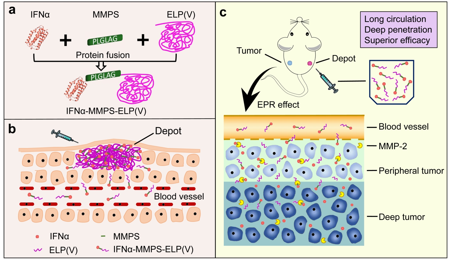 IFNα-MMPS-ELP(V)抗腫瘤示意圖:(a)基因工程法設計合成IFNα-MMPS-ELP(V)(b)溫敏性儲庫第1步釋放(c)酶響應性第2步釋放