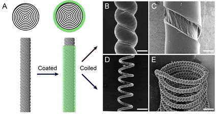 美國(guó)麻省理工學(xué)院(MIT)的Polina Anikeevak教授團(tuán)隊(duì)在同期的Science上報(bào)道了一種可以將類“黃瓜須”結(jié)構(gòu)的人工肌肉進(jìn)行規(guī)模化制備的方法,且該方法能夠制備出不同尺寸的人工肌肉纖維。簡(jiǎn)單的原理是通過(guò)“冷拉”技術(shù),制備含有聚乙烯(PE)和環(huán)烷烴彈性共聚物(COCe)的雙層不規(guī)則纖維。在“冷拉”的過(guò)程中,COCe彈性體被拉長(zhǎng),該復(fù)合纖維在釋放預(yù)拉伸之后,縮回自動(dòng)生成了“黃瓜須結(jié)構(gòu)”。