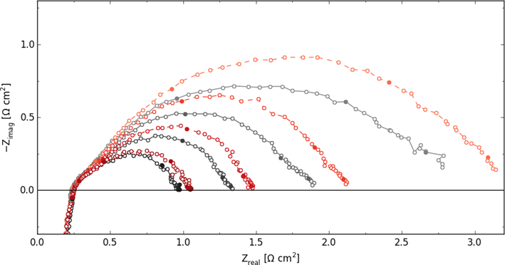 圖3. (A)極化曲線;(B) 記錄在20、40、80、150mAcm-2下的奈奎斯特圖,其中灰色為初始測(cè)量曲線,紅色虛線為試驗(yàn)結(jié)束后測(cè)量曲線;(C)在1mol L-1 KOH溶液中60 ℃條件下進(jìn)行水電解測(cè)試