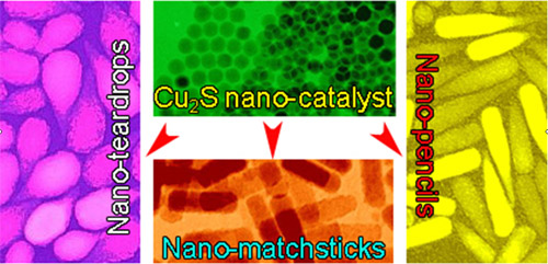 最近,該課題組在系統研究工作基礎上,與國家納米中心的唐智勇教授及北京交通大學光電子技術研究所聯合報道了納米尺寸的Cu2S-In2S3異質結構材料的制備與形貌控制機理研究(J. Am. Chem. Soc., 2008, 130, 13152-13161)。他們證明了導體硫化銅納米顆?梢源呋蚧熂{米晶體的生長,形成具有“半導體-半導體異質結構”的納米材料,而類似的催化作用之前只在金屬類納米顆粒中被觀察發現。他們的研究還表明在硫化銦納米材料的形成過程中,由銅、銦前體化合物與反應介質十二硫醇的相互作用所導致的凝膠化現象可直接影響納米材料的晶體生長動力學。據此,通過對凝膠化過程的控制,他們成功地實現了具有異質結構的火柴形及淚滴形的Cu2S-In2S3納米材料以及鉛筆形In2S3納米材料的制備。