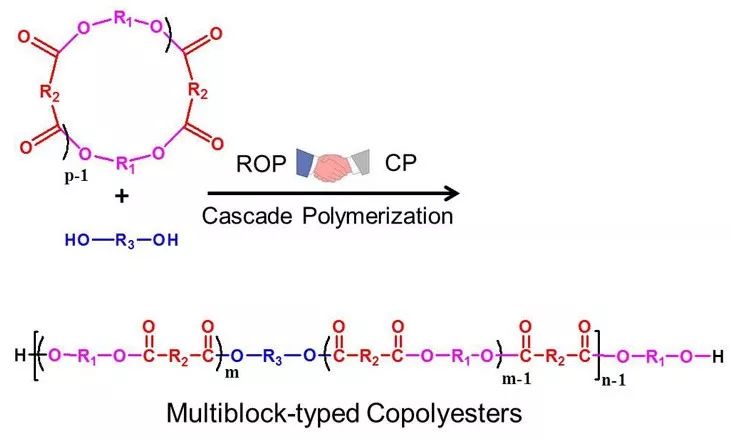 聚酯是一類主鏈中含有酯鍵的聚合物,因其優異的性能得到了廣泛的應用。通常可采用縮合聚合(如芳香族聚酯)或開環聚合(如聚乳酸和聚己內酯)方法合成。有別于采用縮合聚合或開環聚合的傳統思路,蘇州大學屠迎鋒教授課題組于2013年提出了將開環聚合和縮合聚合在同一聚合體系中級聯的策略,即采用基于二酸二醇的大環內酯與二醇分子進行開環-縮合級聯聚合(PROP),合成共聚酯或聚酯多嵌段共聚物的方法。該方法克服了縮合聚合中對于二酸和二醇的高純度及嚴格的等當量投料要求的問題,以及開環聚合中單體種類較少,功能性基團難以引入及含量低的問題,具有鏈式聚合和逐步聚合各自的優點,可高效快速合成具有較高分子量的聚酯、共聚酯及其多嵌段共聚物。該工作提供了一種新型聚酯及其嵌段共聚物的合成方法,系列成果已發表論文11篇。