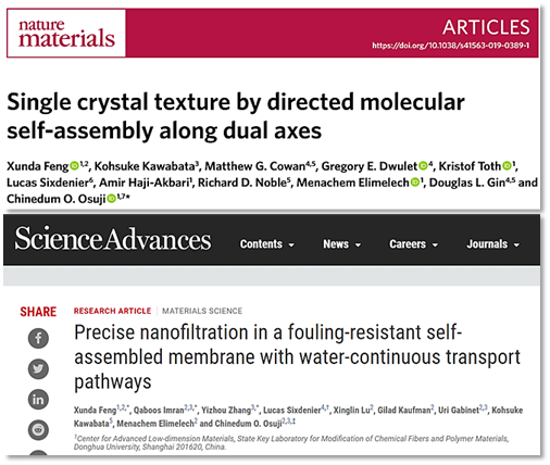 近日,東華大學先進低維材料中心特聘研究員馮訓達在低維材料結構調控和應用領域取得系列重要進展,相關成果發表以《具有連續水通道、抗污染的自組裝納濾膜》《Precise nanofiltration in a fouling-resistant self-assembled membrane with water-continuous transport pathways》(Sci. Adv. 2019, 5, eaav9308)為題發表在國際頂尖學術期刊《Science Advances》上,馮訓達為第一作者,賓夕法尼亞大學教授Chinedum Osuji(齊內德姆·奧蘇吉)為通訊作者,中國工程院外籍院士、耶魯大學教授Menachem Elimelech(梅納赫姆?埃利梅萊赫)為合作作者。