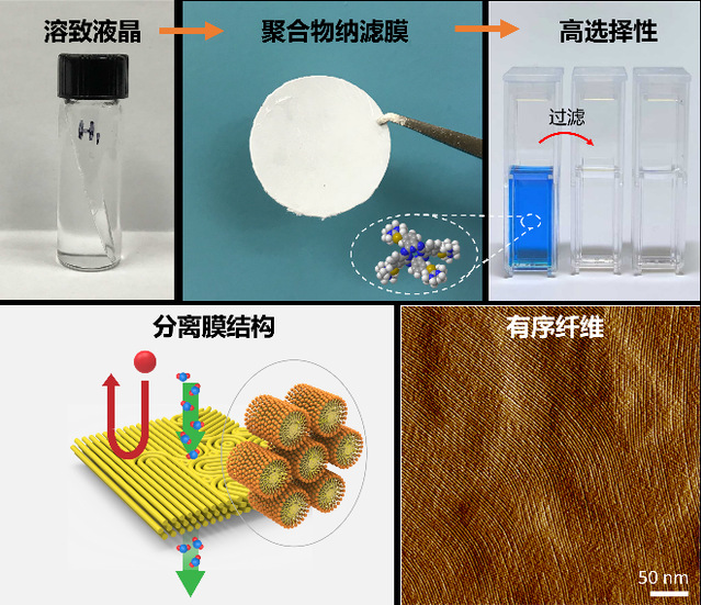 在文章中,該研究利用最常見的表面活性劑形成的溶致液晶為模板,構筑一種由高度有序自組裝納米纖維組成的,同時具有高滲透性、高選擇性、抗菌性的聚合物分離膜。作為一種代表性的低維材料,這種新型的聚合物分離膜利用了納米纖維有序自組裝產生的均一縫隙作為連續的水通道,對有機小分子(在1-2 nm范圍內)顯示出精確的尺度選擇性,同時也具備很高的水通量(水滲透率可達10 L m?2 hour?1 bar?1 μm)。此外,由于納米纖維表面的季銨基團,該膜具有優異的抗微生物性能。基于以上特征,所制得的聚合物納濾膜有望克服傳統聚合物水處理膜由于內部結構不規則而導致的選擇性差等問題,實現其在實際水凈化應用中的突破。此領域研究目前是先進低維材料中心的研究重點之一,馮訓達課題組將在后續研究中進一步探索這種有序纖維分離膜在海水淡化等領域的應用。