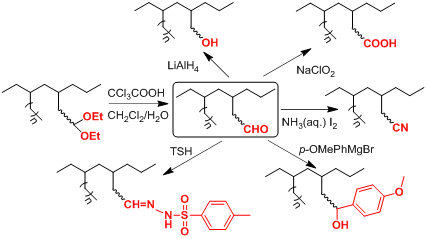 圖2. 縮醛官能團(tuán)化聚乙烯的水解及其后修飾反應(yīng)