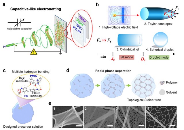 面對(duì)這一挑戰(zhàn),研究團(tuán)隊(duì)受自然界生物材料結(jié)構(gòu)啟發(fā):網(wǎng)絡(luò)狀纖維材料,如蜘蛛網(wǎng)、蜂巢等,可有效提高材料的利用率及其多功能性。創(chuàng)新性地采用芳綸/聚氨酯雙組分聚合物溶液,通過類電容靜電噴網(wǎng)技術(shù)制備出了一種新型“剛?cè)岵?jì)”的高效、超薄、高透光二維納米網(wǎng)絡(luò)結(jié)構(gòu)纖維材料。通過調(diào)控接收基材介電性能以控制微電場的分布狀態(tài),實(shí)現(xiàn)了荷電液滴噴射-形變-自組裝的精確調(diào)控,大幅提高了單層纖維材料中納米網(wǎng)絡(luò)結(jié)構(gòu)的覆蓋率(提升10倍),從而顯著增強(qiáng)了網(wǎng)絡(luò)纖維材料對(duì)超細(xì)顆粒物的捕集能力。同時(shí),兼具剛性與粘彈性的雙組分芳綸/聚氨酯體系與二維網(wǎng)絡(luò)結(jié)構(gòu)有機(jī)結(jié)合,賦予了網(wǎng)絡(luò)纖維材料“剛?cè)岵?jì)”的特性,其材料表現(xiàn)出優(yōu)異的結(jié)構(gòu)穩(wěn)定性和力學(xué)性能(41.3 MPa),從而使材料在保持超。▇350 nm)、高透光(~85.6%)的前提下依然可實(shí)現(xiàn)對(duì)鹽性、油性超細(xì)顆粒物的高效低阻過濾(氯化鈉PM0.3:99.984%,癸二酸二異辛酯PM0.3:99.947%;壓阻僅為0.07%個(gè)大氣壓)。此外,該納米網(wǎng)絡(luò)纖維材料可有效捕集并殺滅(紫外照射下滅菌效率為90.5%)空氣中的致病菌,具有優(yōu)異的生物防護(hù)功能。