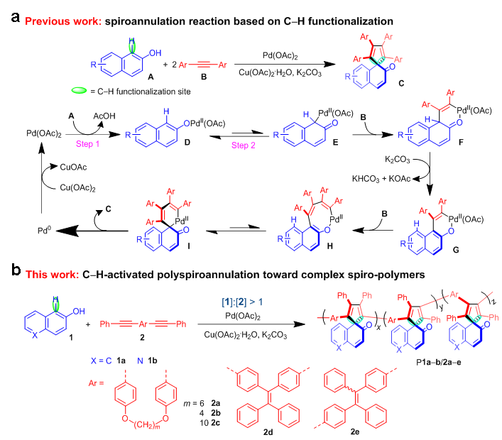 圖1. 螺環(huán)化小分子反應(yīng)及衍生出的C-H活化的螺環(huán)化聚合反應(yīng)