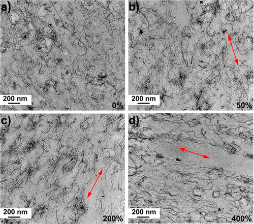 圖2. 填充20份CNTs復合材料的TEM照片,拉伸比分別為(a)0%,(b)50%,(c)200%和(d)400%