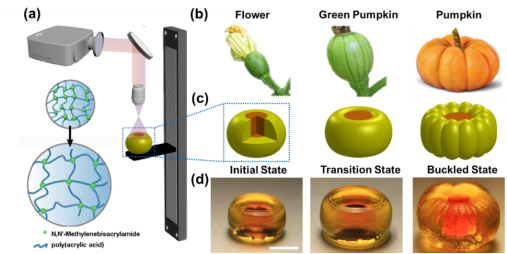 這一工作提出了一種以四維打印制備仿生結構為手段研究生物生長種的形態演化的方法。該工作打印了一種“南瓜”結構,實現了對其的形貌調控并建立了模型對其進行理論分析。因此拓寬了對原本生物結構本身的認知并展示了該方法的可行性,對于生物研究,軟機器人以及增材制造領域有著潛在的應用。