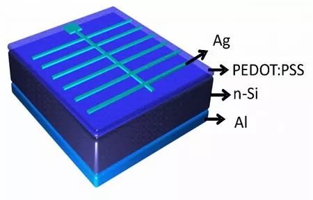 在傳統硅電池制備過程中,p-n結的形成需要在高溫(800 °C-900 °C)下才能進行。在高溫下,通過氣體擴散作用,摻雜離子從表面進入到N-型(P-型)硅內部,形成p-n結。但是,對硅基底進行N-型摻雜的磷化氫(PH3)氣體和P-型摻雜的乙硼烷(B2H6)氣體,都屬于易燃有毒氣體,并帶有腐蝕性,導致電池制備流程比較復雜。導電聚合物(PEDOT:PSS)作為一種水基溶液,可以在室溫下用旋涂法沉積在N-型硅表面上。基于上述優點,導電聚合物(PEDOT:PSS)型雜化硅電池(如圖1)的制備簡易,不涉及易燃有毒氣體的擴散及高溫離子摻雜,可以極大地削減制造成本,為硅電池的發展提供了新的思路。