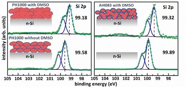 近日,蘇州大學孫寶全教授和Steffen Duhm教授團隊聯合柏林洪堡大學Norbert Koch教授團隊,首次通過光電子能譜儀(XPS),直接得到了導電聚合物薄層覆蓋之后硅表面上被誘導產生的能帶彎曲大小,進而證明了N-型硅基底表面上確實有強反型層(P-型層)的出現,與其他文獻報道的結論相吻合,即一個不需要借助外部離子摻雜的P-N結產生于N-型硅表面,實現對電子空穴的有效分離及提取。通過提高旋涂儀的轉速并稀釋導電聚合物原始溶液(PEDOT:PSS)的方式,雙方團隊制備了厚度低至5nm的一系列薄膜,實現了對底部硅基底產生的光電子的收集。硅基底上能帶彎曲大小的獲取過程如下:首先,探測純凈無覆蓋物的N-型硅基底的XPS-Si2p信號,得到芯層能級Si2p3/2峰的結合能,作為參考;然后,探測覆蓋導電聚合物之后的N-型硅基底的XPS-Si2p信號,得到此樣品芯層能級Si2p3/2峰的結合能。對比兩者結合能的差別,即可獲得N-型硅基底上的能帶彎曲大小,進而可以判斷有無強烈反型層形成。雙方團隊還發現,加入有機溶劑DMSO,不僅可以提高薄膜的導電率,還可以提高Si2p峰的偏移量,即意味著被誘導產生的能帶彎曲幅度的提升;降低原溶液的PEDOT含量,將導致能帶彎曲的幅度降低,如圖2所示。