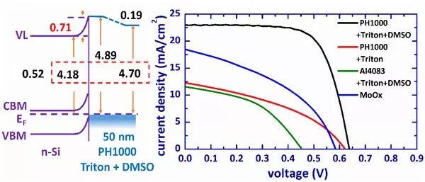 圖3.N-型硅與導電聚合物PEDOT:PSS(PH1000+Triton+DMSO)界面處的能級排布示意圖(左)。不同雜化硅(N-型)電池的器件效率對比圖(右)。
