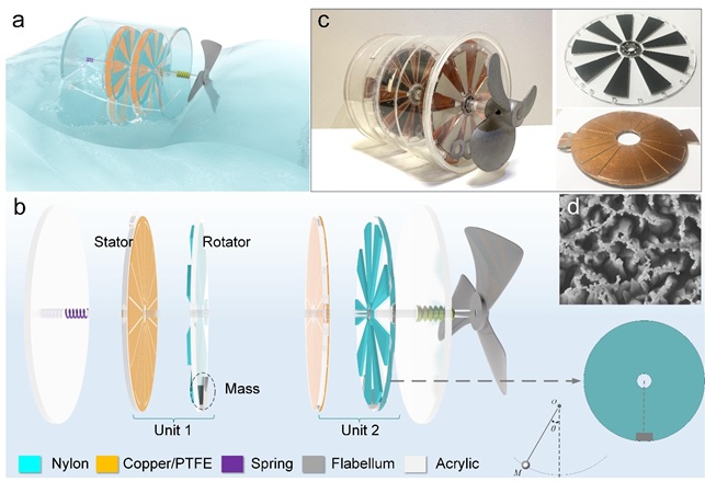 a) 摩擦納米發(fā)電機的水中示意圖。b) 摩擦納米發(fā)電機的結構分解圖。c) 定子和轉子的照片。d) PTFE摩擦層的SEM圖像