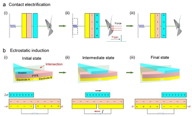 a) 摩擦納米發(fā)電機的接觸帶電過程。b) 摩擦納米發(fā)電機的靜電感應實現電輸出過程。