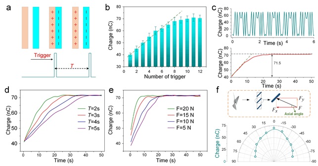 a) 摩擦納米發(fā)電機所受環(huán)境激勵示意圖。b)不同激勵次數的轉移電荷數量。c) 連續(xù)激勵轉移電荷數量曲線。d) 不同激勵間隔時間的轉移電荷數量曲線。e) 不同激勵作用力的轉移電荷數量曲線。e) 不同激勵角度的轉移電荷數量曲線。