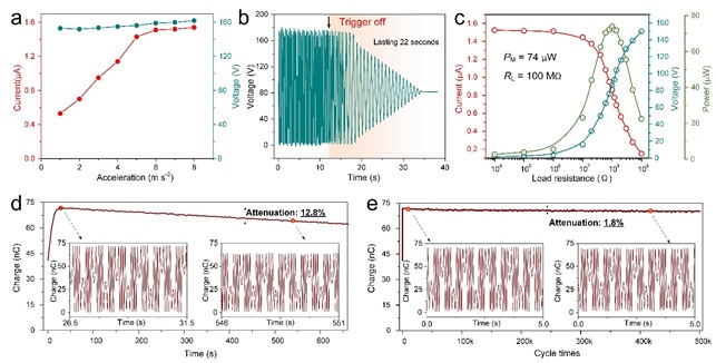 a) 不同激勵加速度的電壓和電流輸出。b) 單次激勵下電輸出特性。c) 在各種負載下的峰值電流、電壓和峰值功率輸出。d) 摩擦層表面電荷數量的變化。e) 摩擦納米發(fā)電機電輸出的耐久性測試。