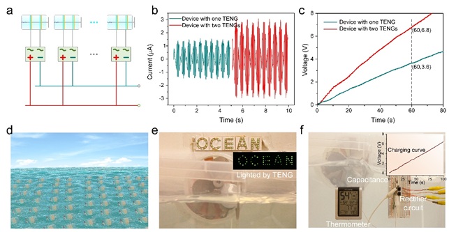 a) 摩擦納米發(fā)電機的整流輸出陣列示意圖。b) 單一摩擦納米發(fā)電機中嵌入不同數量摩擦層的電輸出對比。c) 嵌入不同數量摩擦層的充電測試對比。d) 水波驅動下,摩擦納米發(fā)電機點亮“OCEAN”LED的照片。e) 摩擦納米發(fā)電機驅動溫濕傳感器的照片。
