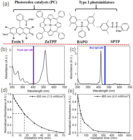 圖1. (a)所使用的光引發(fā)劑及光催化劑的結(jié)構(gòu)式,(b)eosin Y在水中的紫外吸收光譜,(c)ZnTPP在異丙醇中的紫外吸收光譜,(d)SPTP在405 nm紫光輻照下的裂解動力學,(e)BAPO在465 nm藍光輻照下的裂解動力學。