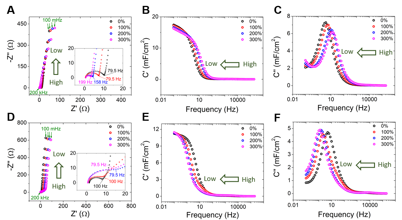 圖4:單向可拉伸CNT-forest電極與Au-CNT-Forest 電極的在不同應(yīng)變下的電化學(xué)阻抗譜的變化和對(duì)比。