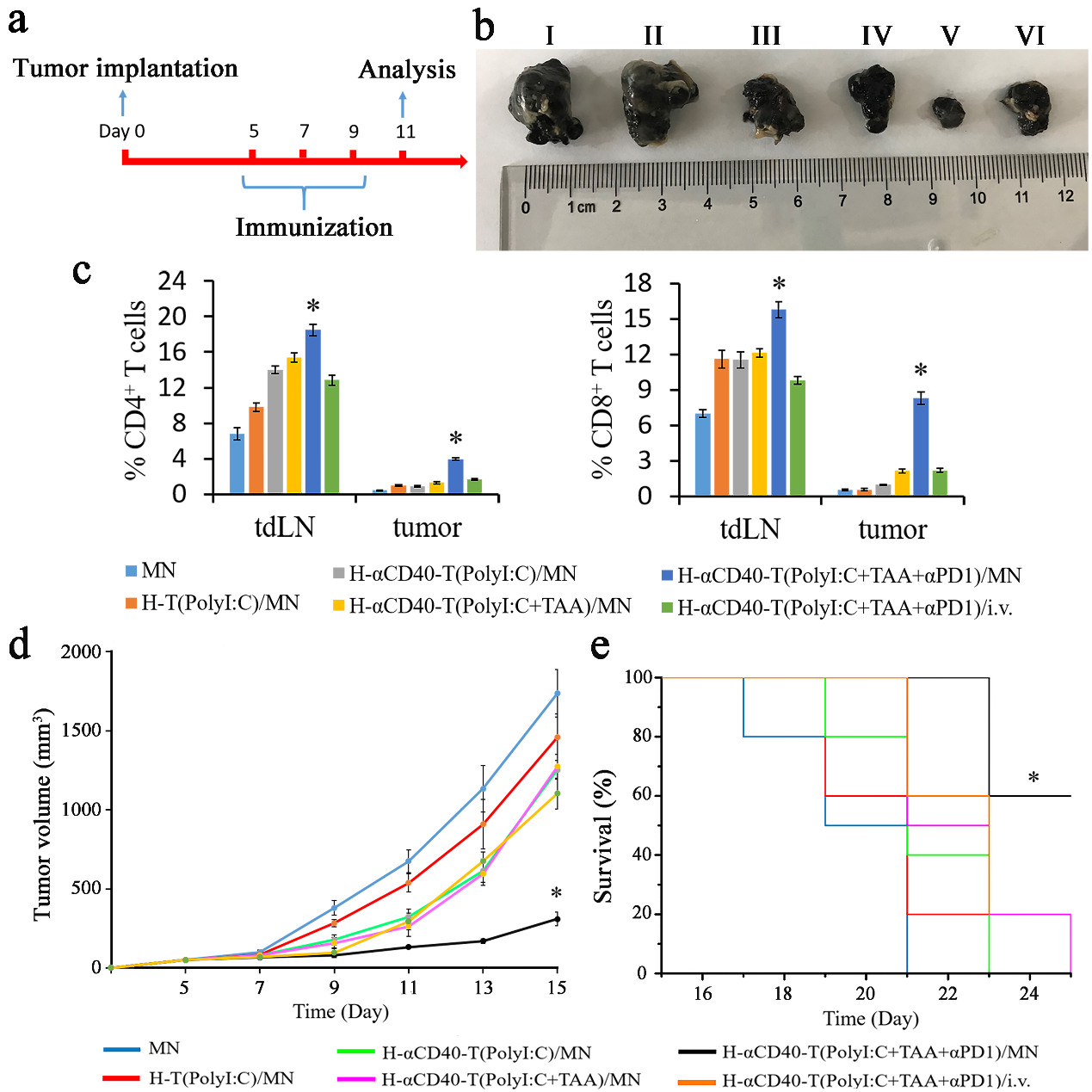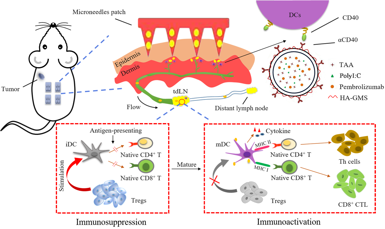 針對這一問題,中國海洋大學孔明教授團隊采用納米復合自溶微針設計,以透明質酸(HA)自溶微針為基質,負載納米傳遞體,傳遞體表面裝配甘油單硬脂酸(GMS)修飾的透明質酸(T-HA-GMS),表面連接 CD40蛋白抗體(αCD40),內部包載免疫佐劑PolyI:C、相關抗原,結合αPD1復合給藥,構建腫瘤引流淋巴結靶向疫苗。復合疫苗能夠自發調控疫苗輸送和特異性免疫應答,逆轉腫瘤引流淋巴結免疫抑制,增強抗腫瘤效應。