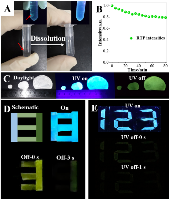 如此性能優異、可調的有機室溫磷光材料是否具有實用性呢?課題組首先驗證了材料的水溶性,由于PVA的存在,該材料能溶于水中,且加熱對其溶解有進一步促進作用。另外,該薄膜在不間斷的紫外光輻射下,在80分鐘的輻射后,磷光性能仍能保持初始強度的80%,光穩定性優異。通過調整構筑薄膜采用的表面皿,依據所用表面皿的直徑,可以得到不同尺寸的復合薄膜,該薄膜平整光滑,均表現出優異的室溫磷光性能。該薄膜較長的磷光壽命也實現了其在加密防偽中的應用,將TPEDB作為墨水在PVA基質上進行書寫,能夠有效觀察到數字在紫外燈下、紫外燈關閉后的發光行為。