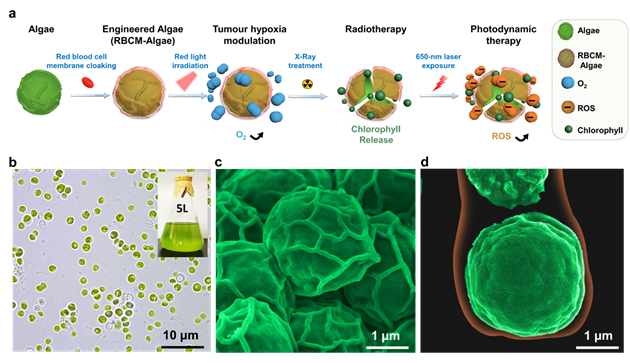 微藻是一種存在自然界中可進行光合作用的單細胞微生物,在生物燃料、食品、保健品等領(lǐng)域均有廣泛應用。近日,浙江大學醫(yī)學附屬第二醫(yī)院/轉(zhuǎn)化醫(yī)學研究院周民團隊與孫毅團隊合作,在工程化活性微藻的體內(nèi)癌癥治療應用上取得新進展,在Science旗下綜合性期刊《Science Advances》在線發(fā)表題為“Engineered algae: a novel oxygen-generating system for effective treatment of hypoxic cancer”的研究論文。