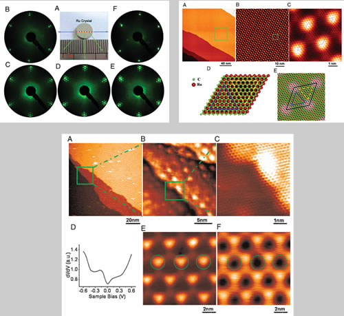 近年來,高鴻鈞研究組在低維納米量子結(jié)構(gòu)的探索方面開展了系統(tǒng)的研究工作。在高質(zhì)量單晶石墨烯薄膜的生長制備方面,他們發(fā)現(xiàn)含碳的釕單晶在超高真空環(huán)境下經(jīng)高溫退火處理可以使碳元素向晶體表面偏析形成外延單層石墨烯薄膜。其初步結(jié)果于2007年報道(Chin. Phys. 2007, 16, 3151), 是國際上最早使用該方法制備石墨烯薄膜的兩個研究組之一,得到國際同行的關(guān)注。這項工作得到了國家自然科學基金,“973”項目和中國科學院的支持。