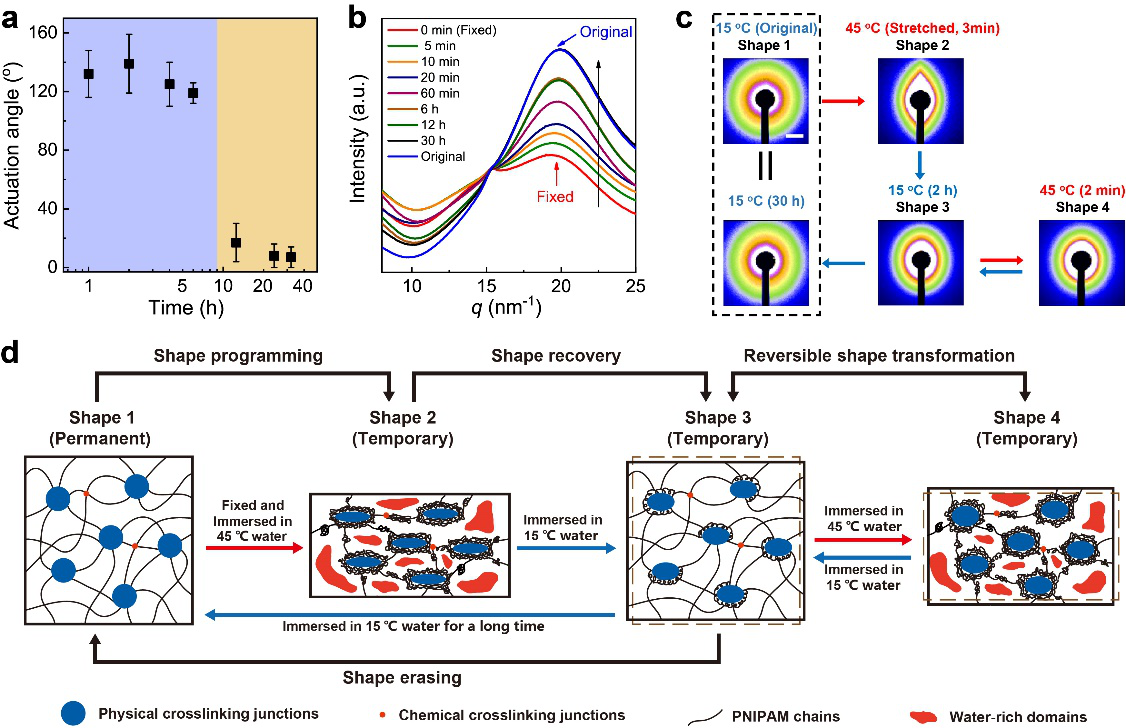 基于同步輻射WAXS和SAXS分析了凝膠在變形過程中的微觀結構變化,證明了非平衡中間態結構在材料變形中的獨特作用和作用機理(圖3)。當施加外力將凝膠在高溫下固定形狀后,SA結晶(或疏水)微區和PNIPAM鏈發生取向,同時PNIPAM鏈發生溫度誘導的構象轉變,凝膠發生相變。當將凝膠放回低溫中回復一段時間后(如2 h),雖然宏觀上形狀已基本回復,但微觀上體系仍處于非平衡的中間態結構,表現為PNIPAM鏈構象未完全回復,且SA結晶(或疏水)微區及其鄰近的PNIPAM鏈仍存在一定取向。當將此狀態的凝膠再次升高溫度時,中間態結構會誘導PNIPAM鏈產生定向的構象變化,使凝膠產生可逆變形。而當將凝膠放回低溫中回復足夠長時間后(如30 h),中間態結構消失,體系達到平衡態,進而實現形狀的重塑。
