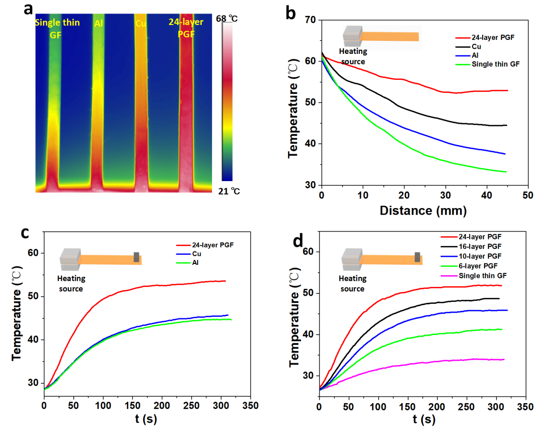 紅外熱圖像直觀地比較了200 μmPGFCu箔和Al箔以及10 μm的石墨烯膜的傳熱速度,不難看出同時(shí)具有高厚度和高熱導(dǎo)率的PGF展現(xiàn)出了最快的傳熱速度,整張膜的溫度分布最均勻(圖6ab)。用恒溫?zé)嵩矗?/span>68℃)分別通過以上膜加熱石墨塊(圖6c),發(fā)現(xiàn)應(yīng)用PGF加熱石墨塊的溫度上升最快,平衡溫度最高。對(duì)前25s時(shí)各膜的熱通量進(jìn)行粗略的計(jì)算,PGF的平均熱通量為0.2002 J s-1,是銅箔(0.0955 J s-1)的兩倍。而且24PGF的傳熱速度也要明顯高于較小層數(shù)的PGF。表明高熱通量取決于高厚度和高導(dǎo)熱率兩個(gè)因素。