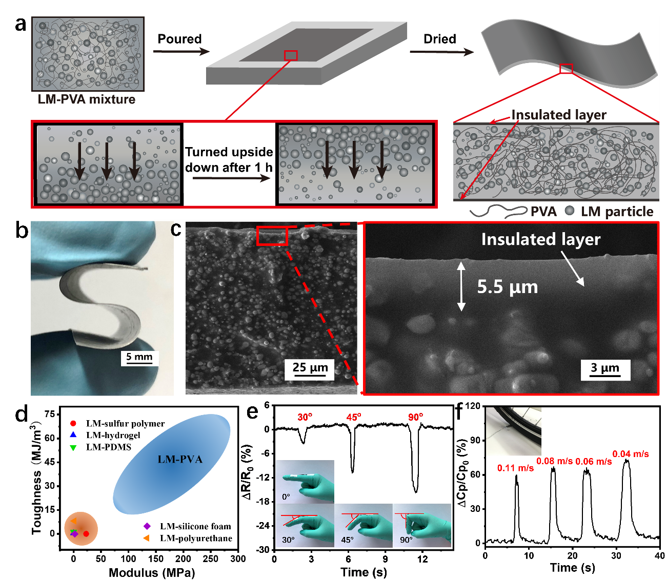 圖2.(a)LM-PVA制備過程。(b)通過彎曲表現LM-PVA的柔性。(c)LM-PVA薄膜截面的SEM圖。(d)LM-PVA與液態金屬-彈性體符合材料的機械性能對比。(e)LM-PVA用于檢測人體關節彎曲程度。(f)LM-PVA用于檢測自行車速度。