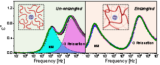 上海交大熊輝明教授課題組從相對(duì)簡(jiǎn)單的無(wú)熱體系出發(fā),設(shè)計(jì)構(gòu)建了兩類(lèi)體系:在纏結(jié)和非纏結(jié)的高分子熔體中引入不同體積分?jǐn)?shù)的小尺寸分子顆粒POSS (polyhedral oligomeric silsesquioxane);以及將高分子熔體限域在大尺寸的嵌段聚合物(PLLA-b-PBO)單晶納米片層形成的膠體液晶當(dāng)中。通過(guò)分子尺度上的化學(xué),作者可以很好地調(diào)控納米顆粒與高分子的相互作用,控制顆粒的尺寸分布以及分散性。對(duì)于高分子基體,作者選擇了聚環(huán)氧丁烷(PBO)。其原因:PBO可以通過(guò)陰離子活性聚合獲得分子量可控、分散度窄、末端明確的高分子;其玻璃化溫度較低,從而避免了納米復(fù)合體系制備中通常較高的工作溫度帶來(lái)的諸多問(wèn)題;更重要的是,PBO是一類(lèi)典型的Type-A型高分子,也就是PBO重復(fù)單元的偶極矩沿著主鏈累積可產(chǎn)生一個(gè)端-端矢量偶極。對(duì)這個(gè)端-端矢量偶極的檢測(cè)可以通過(guò)寬頻介電譜來(lái)進(jìn)行。一方面,端-端矢量偶極漲落的強(qiáng)度可以體現(xiàn)高分子鏈的尺寸;另一方面,它的快慢可以反映高分子鏈的整體運(yùn)動(dòng)。寬頻介電譜儀具有可精確控制的較寬的溫度范圍(-150 ℃ – 400 ℃)和頻率區(qū)間(10-2 Hz - 107 Hz)。因此,高分子多尺度的動(dòng)態(tài)過(guò)程諸如鏈段運(yùn)動(dòng)和鏈運(yùn)動(dòng)通常可以出現(xiàn)在同一個(gè)頻域窗口。寬頻介電譜在同步研究高分子分子動(dòng)力學(xué)及其統(tǒng)計(jì)構(gòu)象方面具有一定的優(yōu)勢(shì)。將其與探測(cè)力學(xué)松弛的流變學(xué)相結(jié)合,對(duì)高分子復(fù)合體系可以有一個(gè)較為獨(dú)特和多角度的認(rèn)識(shí)。