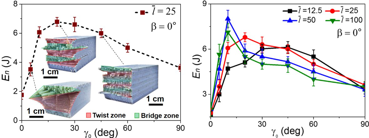 進一步,研究團隊發展考慮裂紋扭轉和纖維橋聯協同增韌的斷裂力學模型,揭示對裂紋取向不敏感的高斷裂韌性起源于DFB結構中的裂紋偏轉和橋聯協同的混合增韌機制;在臨界螺旋角下,裂紋偏轉和橋聯模式間的協同導致最優斷裂耗能(圖3)。