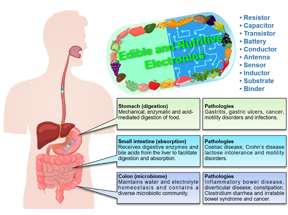 圖1. 可食用、有營養電子器件的組成及其在胃腸道中的診斷及治療應用