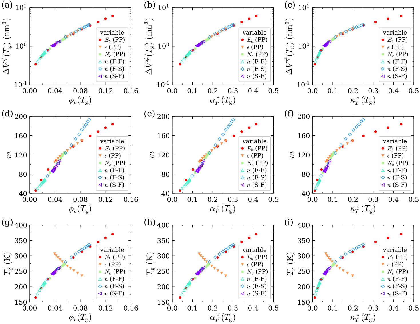 圖2.高分子玻璃化熵理論預測的活化體積、脆性指數(shù)和玻璃化轉(zhuǎn)變溫度與分子堆積效率參數(shù)之間的關(guān)聯(lián)。