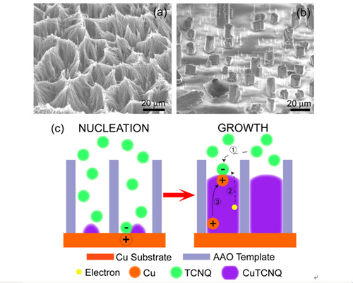 (a) CuTCNQ納米線陣列的掃描電鏡照片;(b) CuTCNQ納米線長出AAO孔道后形成的微米級晶體的掃描電鏡照片;(c) CuTCNQ晶體在AAO孔道中生長過程示意圖