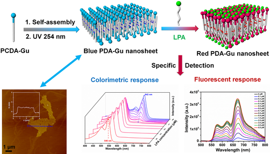 基于前期的研究基礎(chǔ),武培怡教授課題組最近又設(shè)計合成了一種胍鹽頭基的兩親性二炔單體(PCDA-Gu)。PCDA-Gu可在水中自發(fā)組裝成超分子二維納米片,經(jīng)紫外光誘導(dǎo)拓撲聚合后獲得共價鍵連接的超薄PDA-Gu納米片,平面尺寸可達數(shù)微米,而厚度僅為~1.9 nm。PCDA-Gu 分子間的疏水相互作用、氫鍵相互作用和 π-π 堆積相互作用協(xié)同作用起到了固定組裝體的作用,而末端胍鹽陽離子間的靜電斥力穩(wěn)定了單層結(jié)構(gòu)。PDA-Gu 納米片可通過鹽橋相互作用和疏水相互作用,與子宮癌生物標(biāo)記物 LPA發(fā)生特異性結(jié)合,并伴隨產(chǎn)生比色和熒光變化,而 PDA-Gu 納米片的超薄二維結(jié)構(gòu)特征進一步加強了與 LPA 的特異性結(jié)合作用,從而可實現(xiàn)對 LPA 高靈敏定量檢測。相關(guān)工作(An ultrathin polydiacetylene nanosheet as dual colorimetric and fluorescent indicator for lysophosphatidic acid, a cancer biomarker)近期發(fā)表在程正迪院士新創(chuàng)的刊物Giant。