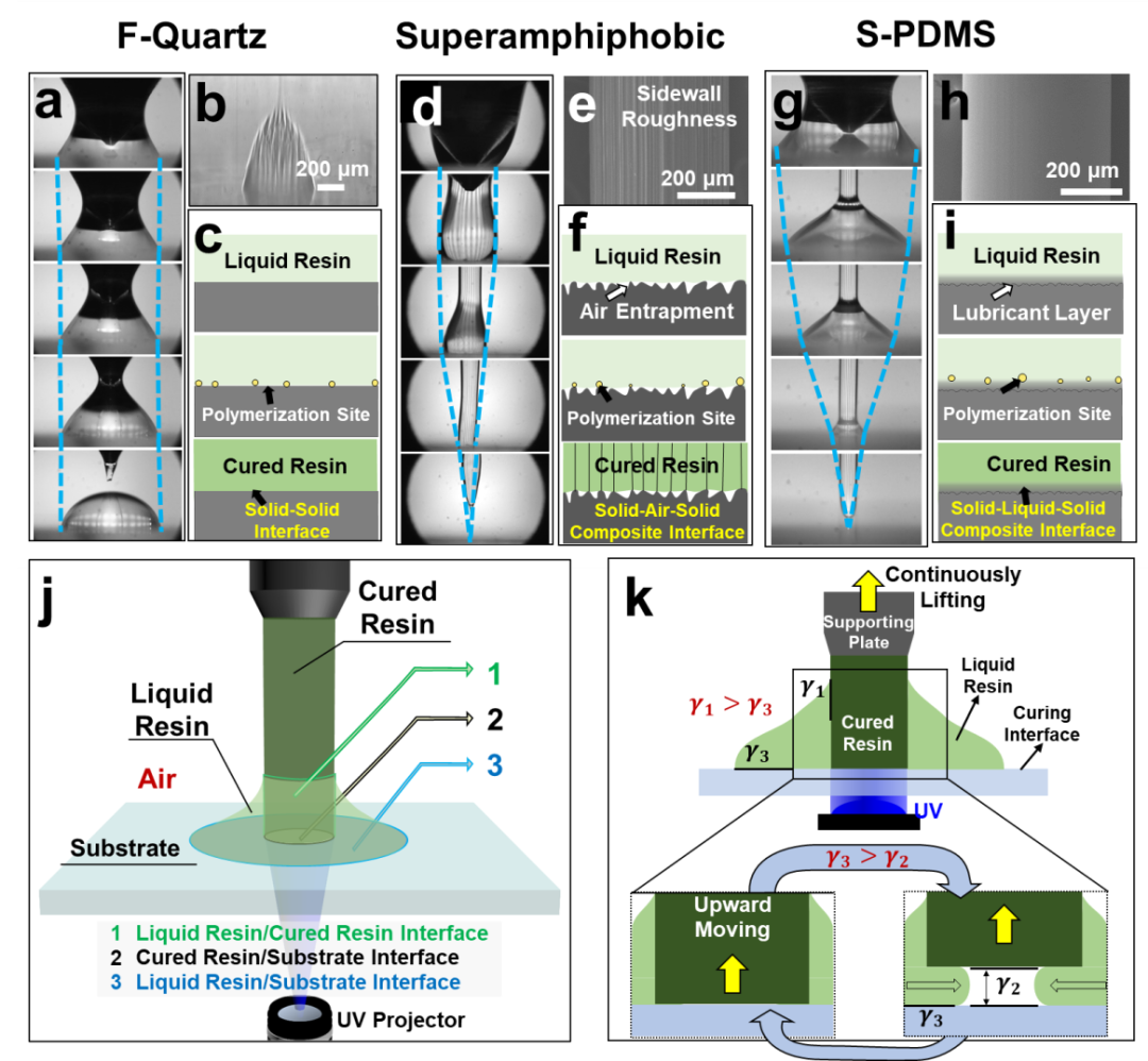 圖1 光固化界面性質對單墨滴3D打印的影響。 (a-c),平滑疏水表面的打印過程,打印結構形貌及機理分析。(d-f), 含有微納復合結構的超雙疏表面的打印過程,打印結構形貌及機理分析。(g-i),仿生超潤滑表面的打印過程,打印結構形貌及機理分析。(j),單墨滴3D打印過程中涉及的三個界面。(k),單墨滴3D打印的規律。