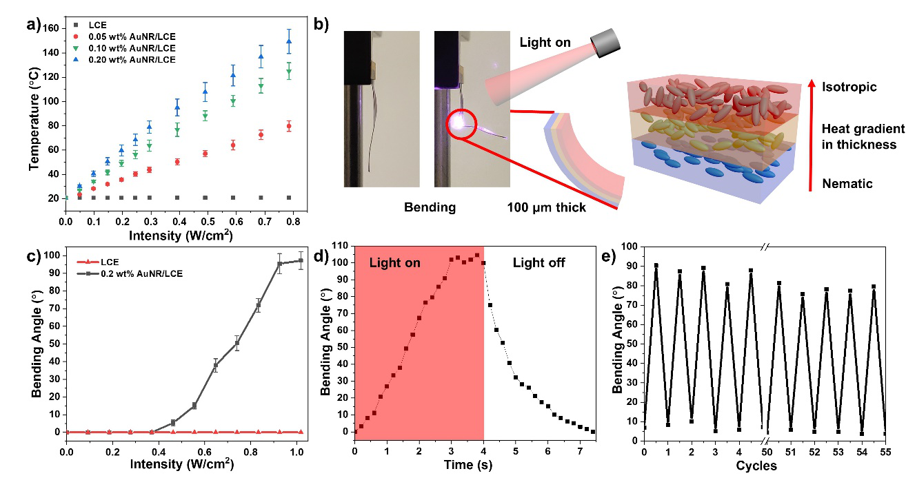 圖二 a)純液晶彈性體和金納米棒液晶彈性體復(fù)合物在不同功率800 nm光下與溫度之間的關(guān)系圖。b)金納米棒液晶彈性體復(fù)合物光照彎曲的可能機(jī)制。c) 0.2 wt% 金納米棒液晶彈性體復(fù)合物彎曲角度和光功率之間的關(guān)系。d,e) 0.2 wt% 金納米棒液晶彈性體在1W/cm-2 800 nm 光下的彎曲角度隨時(shí)間變化的關(guān)系圖和循環(huán)測試圖。