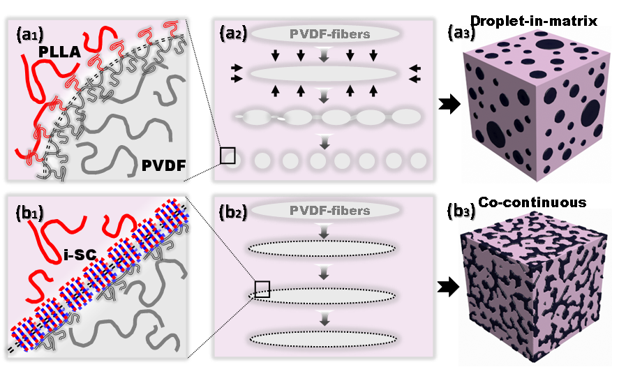圖3. (a) 傳統反應性增容與(b) i-SC增容共混體系相形貌形成機理