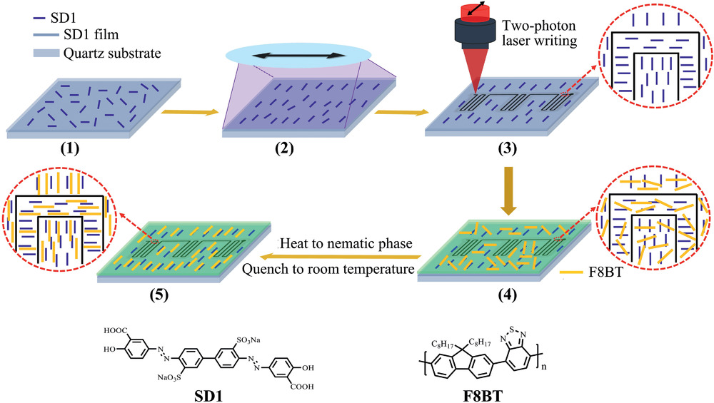 圖一. (1) SD1 photoalignment layer is spin‐coated and (2) aligned initially through uniform exposure to linearly polarized UV illumination. (3) Regions of the photoalignment layer are then realigned using two‐photon laser writing. The SD1 molecules orient perpendicular to the polarization of the incident light; here the reorientation is shown to be orthogonal to that of the UV‐aligned background but it is possible to tune the relative angle by adjusting the laser beam polarization direction. An F8BT film is then spin‐coated onto the SD1 layer (4) and heated to isotropic melt before slow cooling into the nematic LC phase, where the polymer chains become oriented along a direction defined by the SD1 molecular orientation. The polymer chain and associated optical transition dipole moment orientations are then frozen‐in by rapid quenching to room temperature (5) to form a nematic glass film.