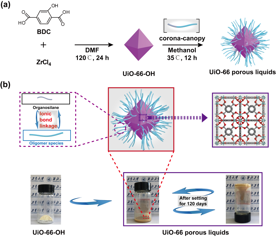 多孔液體(Porous liquids, PLs)是一種具有穩定孔隙結構且呈現宏觀流動狀態的新型材料,其綜合了多孔固體材料的有序孔道結構和液體的連續性、穩定的傳質性等優點,已經在氣體捕集與分離領域表現出巨大的應用潛力。但是在以往研究中通過后合成修飾直接將金屬有機骨架材料(Metal-Organic Frameworks, MOFs)制備I型多孔液體鮮有報道;此外,降低合成成本及簡化合成過程的挑戰依然十分嚴峻。因此尋找一種普適性策略合成I型多孔液體尤為重要。